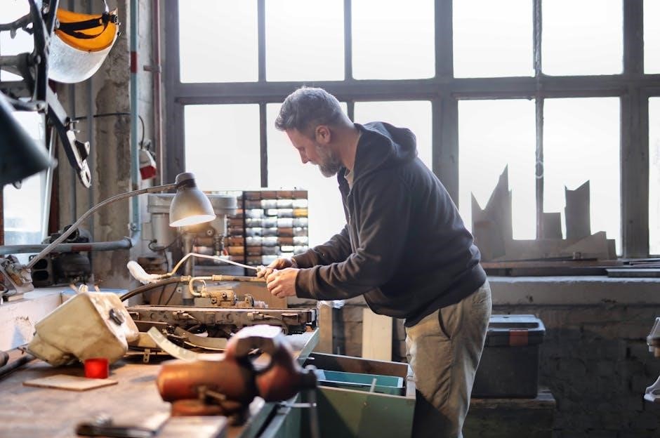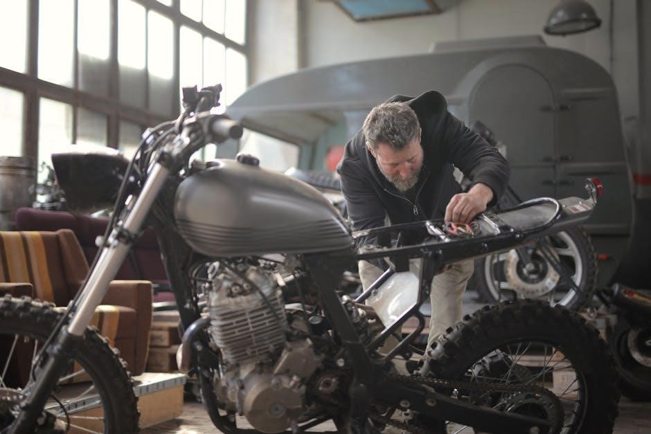 A step-by-step guide to common repairs helps you address issues efficiently. Start by identifying the problem using the manual’s troubleshooting section; Gather the necessary tools and parts before beginning. For example, repairing a faulty ignition switch involves disconnecting the battery, removing the switch, and installing a new one. Always follow the manual’s specific instructions for your model. For complex tasks like engine oil leaks or electrical faults, consult detailed diagrams and procedures. Ensure proper waste disposal for hazardous materials. Safety is paramount, so avoid shortcuts and seek professional help if unsure.